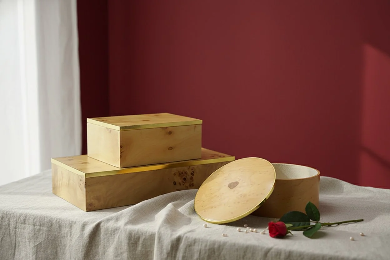 MDF with Mapple burl veneer, velvet lining and brass trim.
